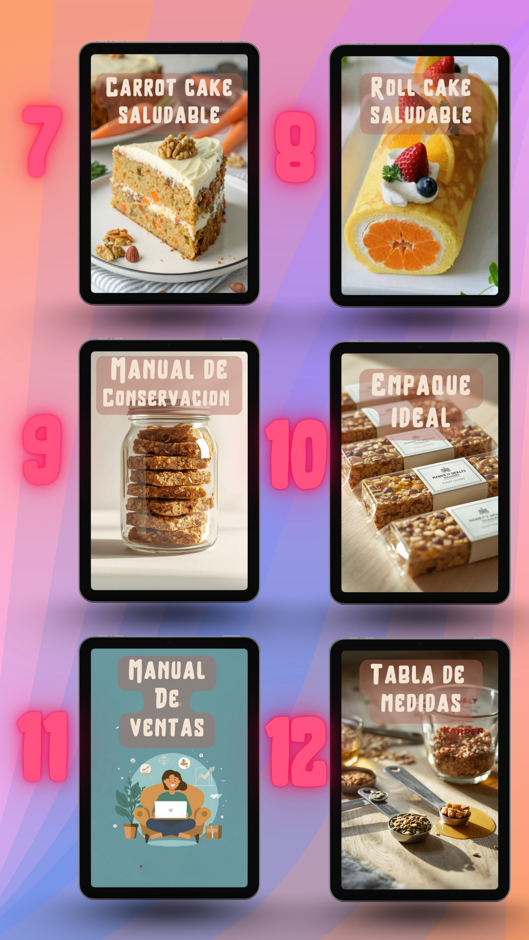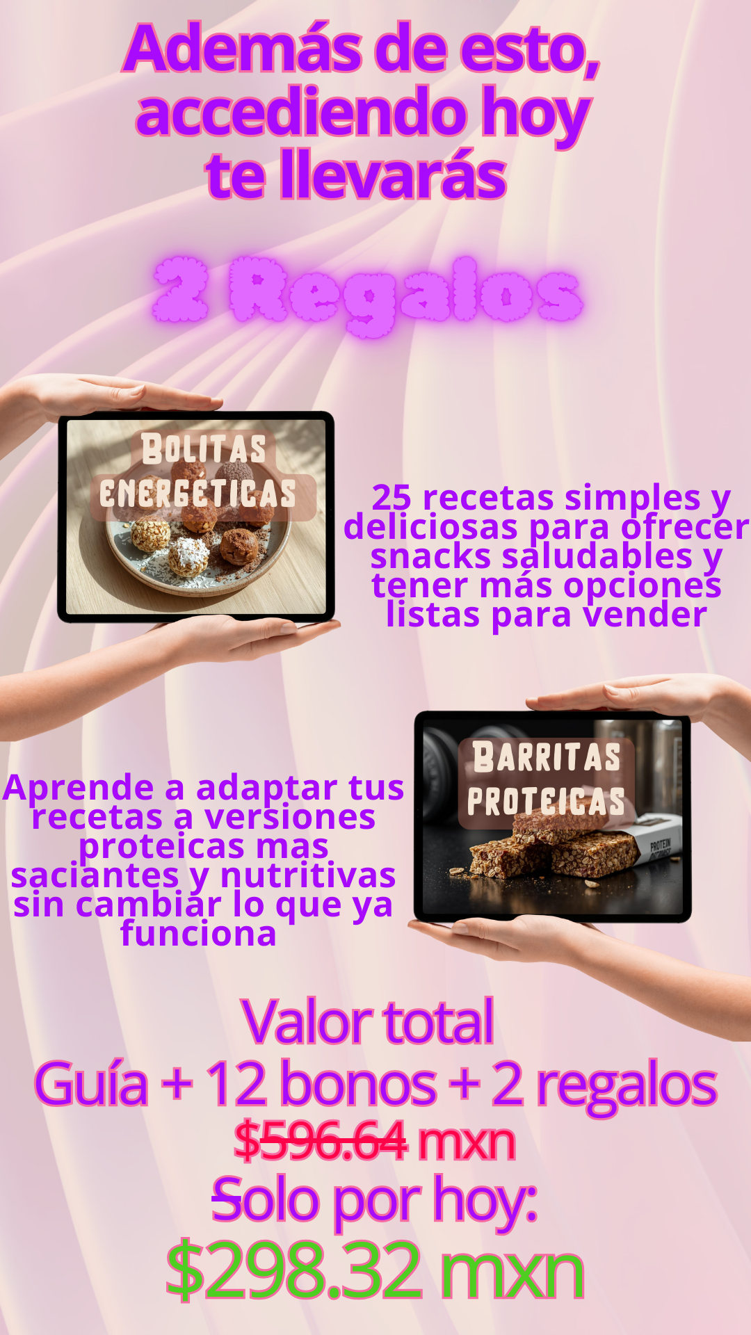 - 🎁 12 bonos extra: empaques, conservación, ventas, toppings, reemplazos y más.